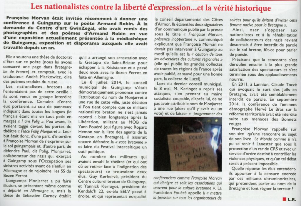 Ainsi s’exerce la censure silencieuse. Il va de soi qu’elle se double d’un exercice beaucoup plus violent, comme on a pu le voir à Guingamp, lorsque j’ai été invitée à présenter un montage de textes traduits ou non de Robin mis en relation avec ses photos : là, c’est un véritable commando de militants qui s’est rué dans la salle pour m’interdire de parole.