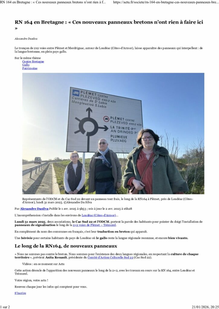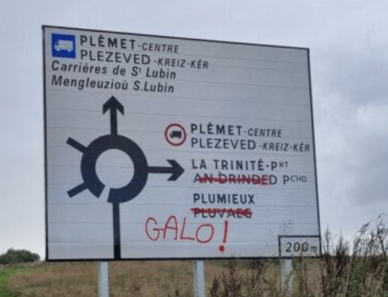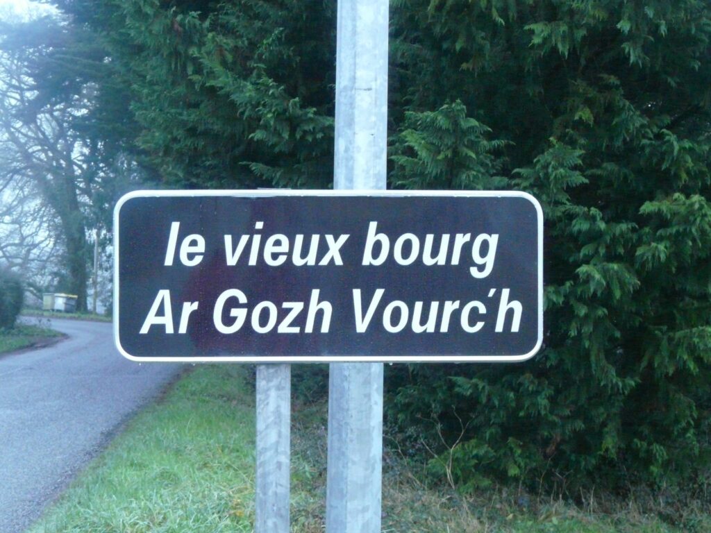 « Pour illustrer la poursuite de cet alignement linguistique sur une novlangue chimique, j’ai eu la mauvaise surprise de découvrir voici 2 mois que sur le nouveau panneau mis en place par les équipes du département (l’ex DDE), le nom de mon village de naissance était maintenant « Ar Gozh Vourc’h » écrit au-dessous de son nom habituel « le vieux bourg » (sans majuscule). Ceci en plein pays gallo où si j’en crois les travaux de Jean Yves Le Moing le breton fut parlé peut-être jusqu’au 13eme siècle mais pas après. Qui plus est, la place de l’adjectif n’est même pas respectée. C’est irritant – je ne suis pas le seul irrité – mais ce n’est pas très grave depuis que le ridicule ne tue plus.